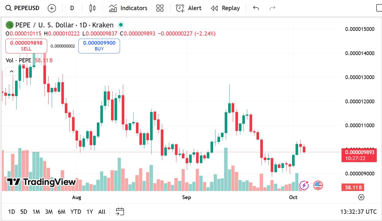 Pepe coin price prediction is still a point of interest for retail traders as meme coins continue to see higher demand. Pepe currently stands at $0.000009898, marking a modest 0.16% increase over the last 24 hours.Ā