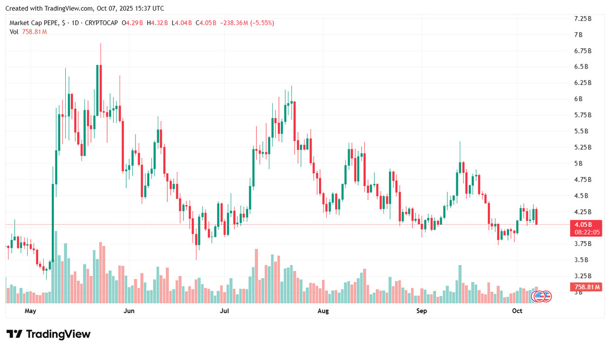 Pepe (PEPE) is the perfect example of how meme culture still holds a grip on crypto. Currently valued in the multi-billion market cap range, it remains one of the most talked-about meme coins of 2025. PEPE’s chart has been a rollercoaster, swinging between surges of whale accumulation and deep corrections. Bulls are targeting critical resistance levels that could push it toward a new rally, but nothing in meme land is ever guaranteed.