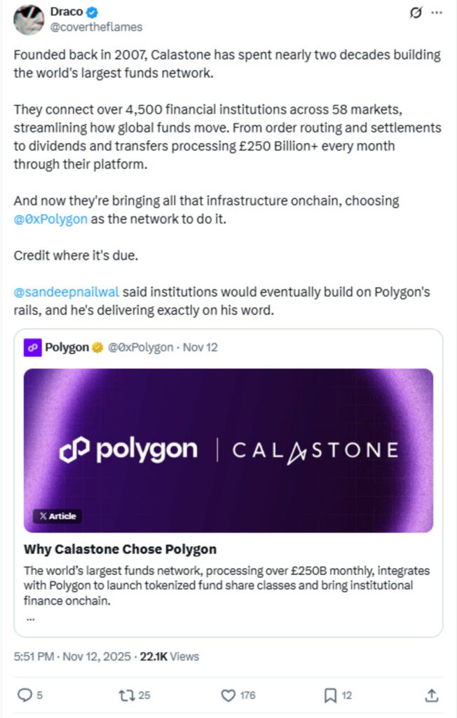 Polygon’s ecosystem strength is further reinforced by Calastone’s partnership, which enables asset managers to distribute tokenized fund share classes directly on-chain using Polygon’s infrastructure; a clear signal of rising real-world adoption.