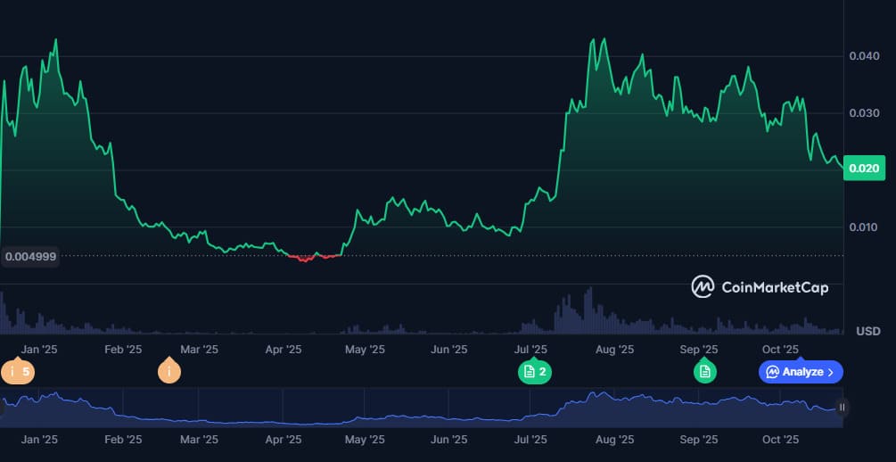 Once the beloved icons of NFT collectibles, Pudgy Penguins transformed into a global Web3 lifestyle brand with partnerships and merch lines. But its token, $PENGU, has faced a cooler stretch in late 2025. Priced near $0.02028, it maintains a $1.27 billion market cap with $243 million daily volume. At the same time, it saw a 2.89% daily bump, its one-month decline of 31% and year-long drop of 64% signal consolidation rather than breakout momentum.