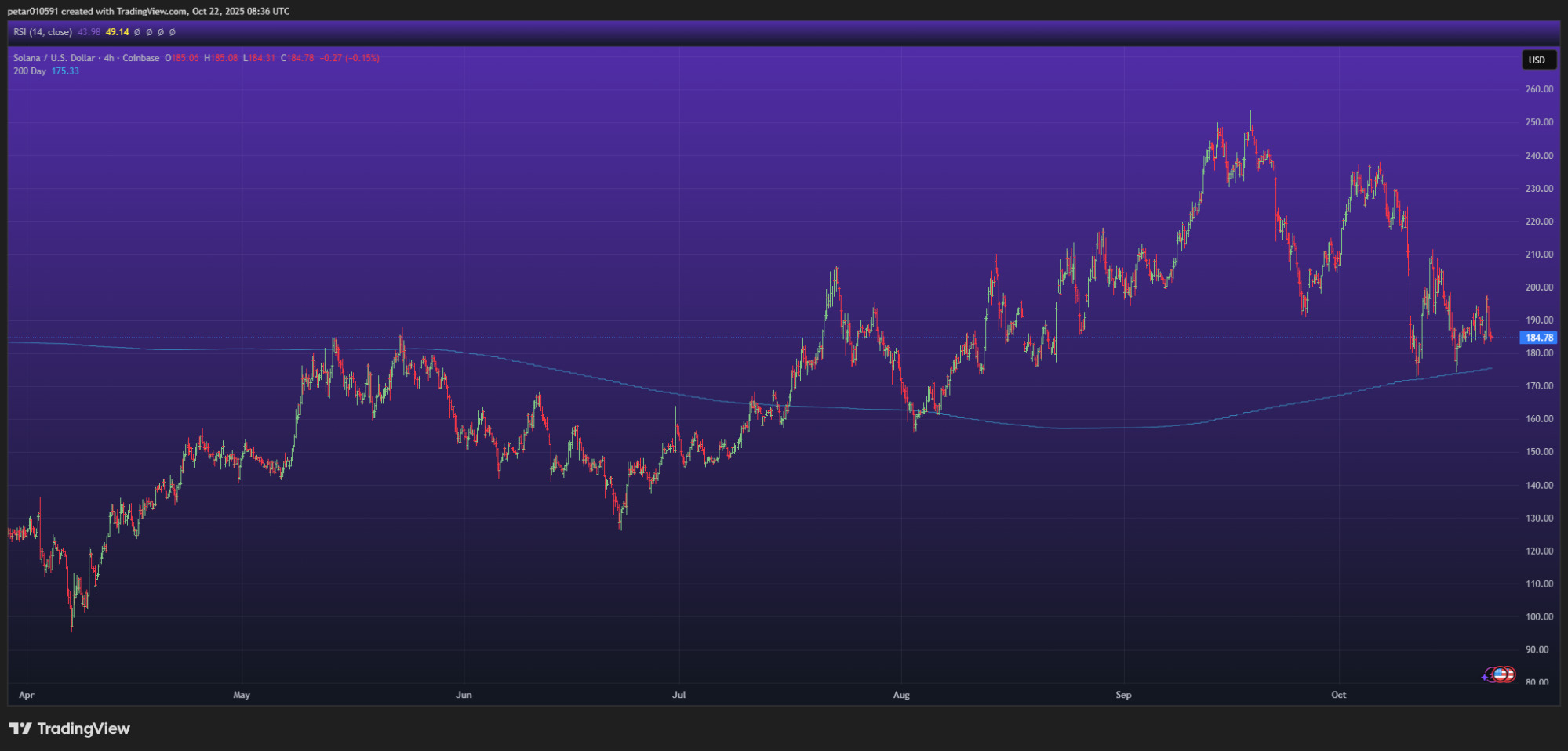 The SOL chart shows clear resistance near $220–$240, with strong support around $170. The 200-day moving average at $175 has acted as a key dynamic support line in recent months.