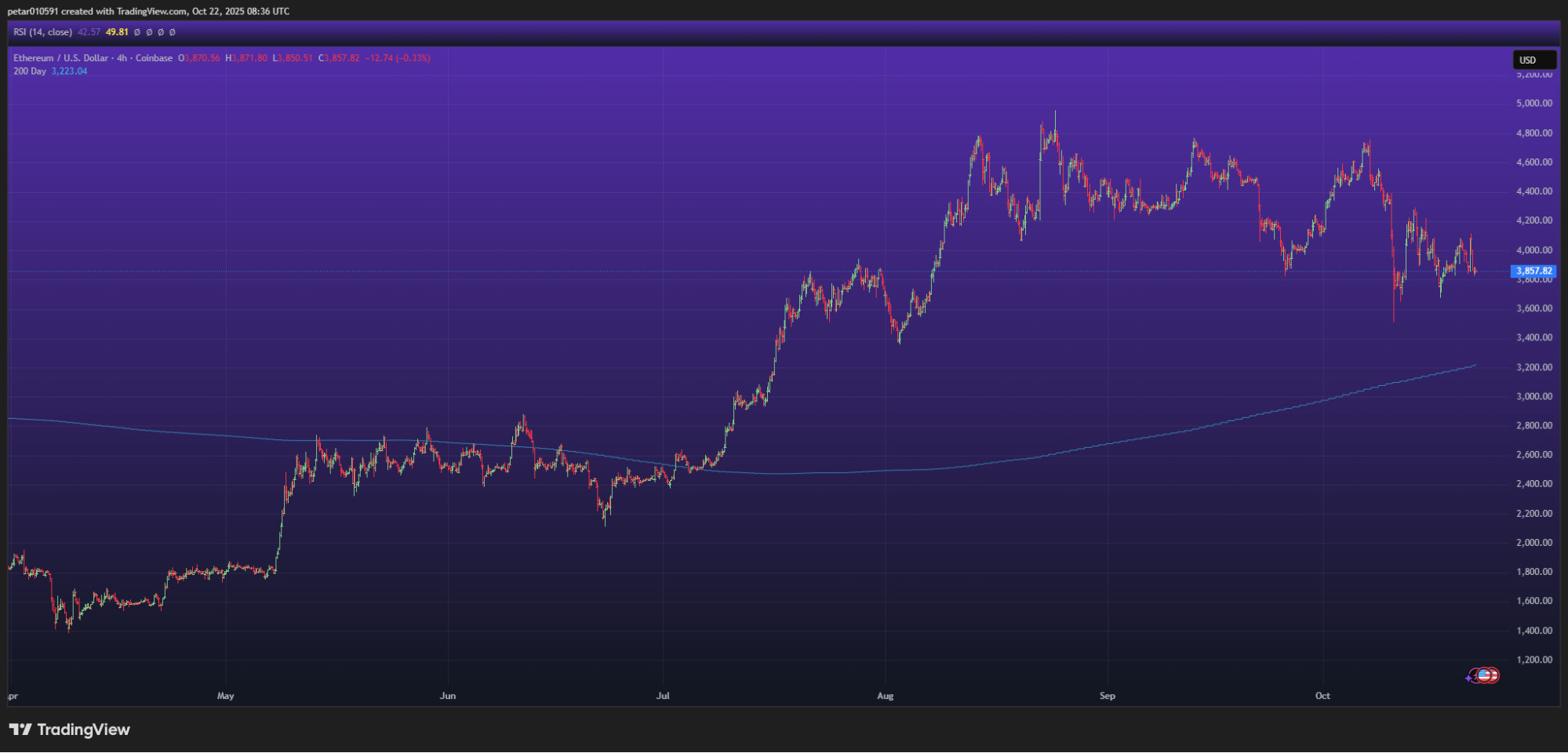 The Ethereum price consolidated in the $3,800-3,900 range after the recent October crashes. The ETH chart shows that price action has cooled around a wide trading range between $3,600 (support) and $4,200 (resistance). The 200-day moving average is now near $3,200, and this is now the biggest support zone.