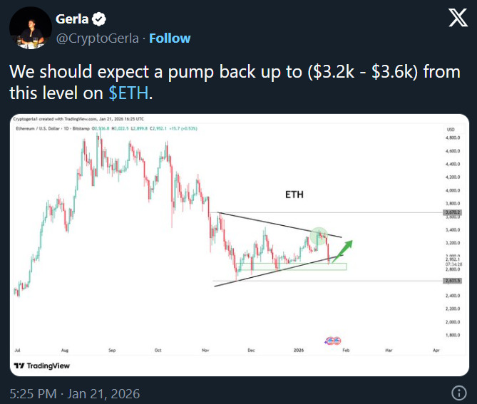Some market commentators remain optimistic about a potential recovery, with influencer Gerla posting on X that ETH could move back toward the $3,200–$3,600 range.