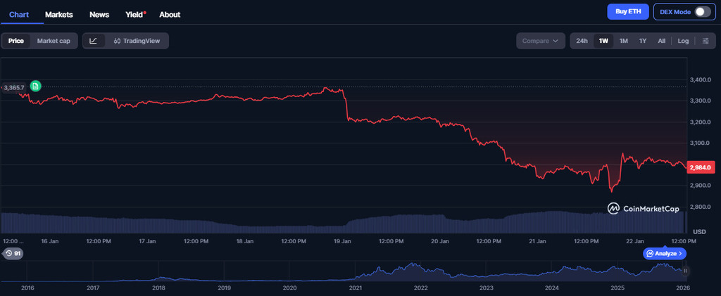 Ethereum has also experienced volatility, with CoinMarketCap reporting a weekly decline from approximately $3,350 to around $2,900—representing a pullback of more than 10%.