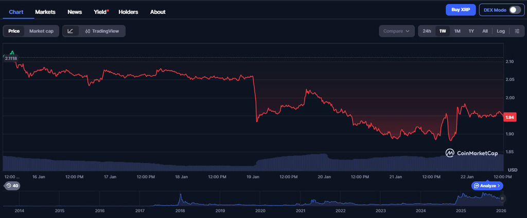 Ripple has seen a modest decline over the past week, with CoinMarketCap showing a drop from around $2.10 to near $1.95 in the last seven days. This reflects a roughly 5% pullback during that period.