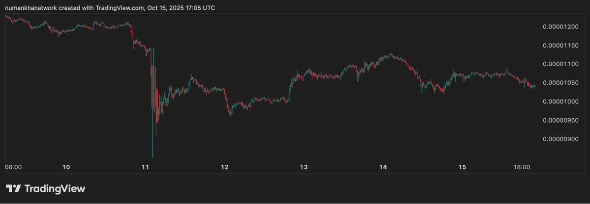 At $0.00001039 on October 15, SHIB is clawing back from its $0.0000085 low. But the Shiba Inu price is still down over 14% this week. Traders aren’t exactly rushing back. The meme coin, once powered by hype, now looks stranded in a market that’s moving toward utility.