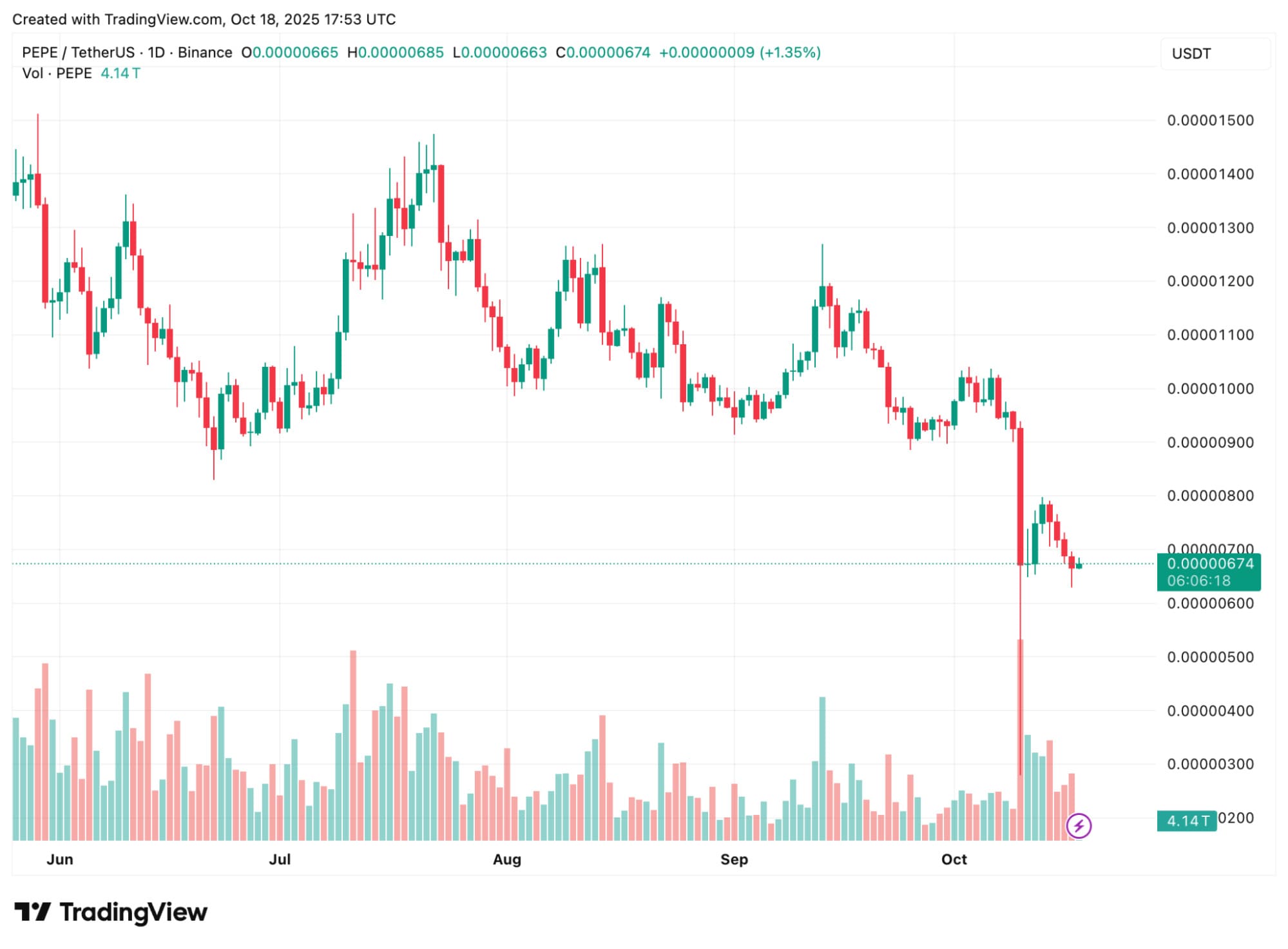 PEPE is trading near $0.00000674 after a sharp slide from its December 2024 high. Recent whale distributions, including a sale of over 1.5 trillion tokens, pressured the price and cooled momentum. The market is also flirting with new narratives, as rivals like Little Pepe grab attention, while some capital rotates toward utility-driven projects.