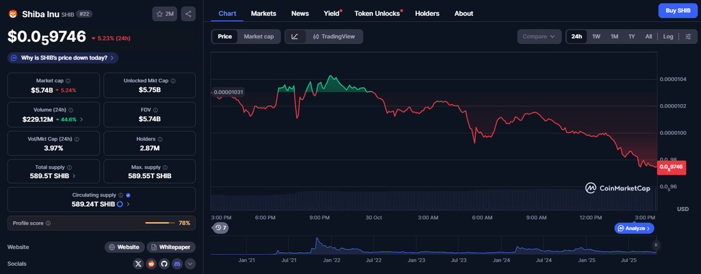Shiba Inu price today stands at $0.000009749, down 5.21% in 24 hours, as trading activity slows across meme coin markets.