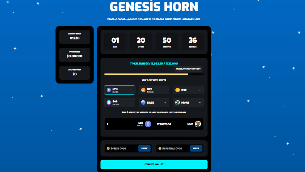 The live Genesis Horn dashboard already shows strong traction, with over $1,862 raised from 28 holders in Stage 1.