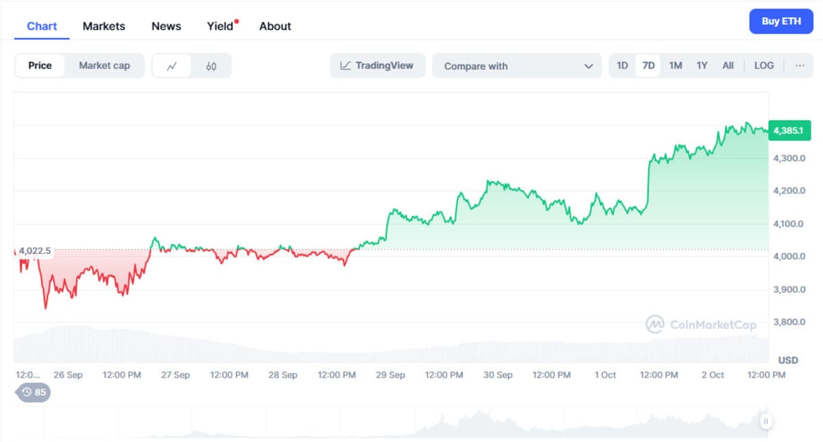 For now, CoinMarketCap data shows the Ethereum price has soared by 4.41% on the 7D timeframe. The altcoin has claimed the $4,300 mark and could rise to the next key resistance at $4,400 soon if buying pressure keeps increasing. If profit-taking increases, the Ethereum price might fall to the $4,100 support.