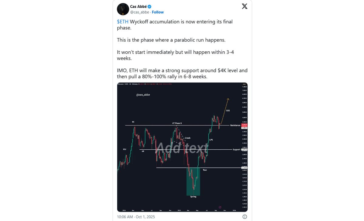 He noted that the ETH price is in the last phase of the Wyckoff accumulation with a parabolic run ahead. Cas Abbe expects the Ethereum price to form a strong support around $4,000 before soaring by 80%-100% in the next 6-8 weeks.
