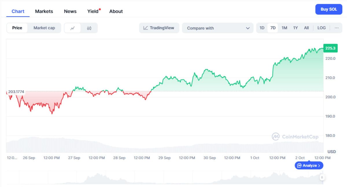 The Solana price has increased by 4.8% over the past week, per CoinMarketCap. The recent surge follows a bullish reversal from $195–$200 to $220. If this momentum continues, Solana could test the next resistance around $235–$240.
