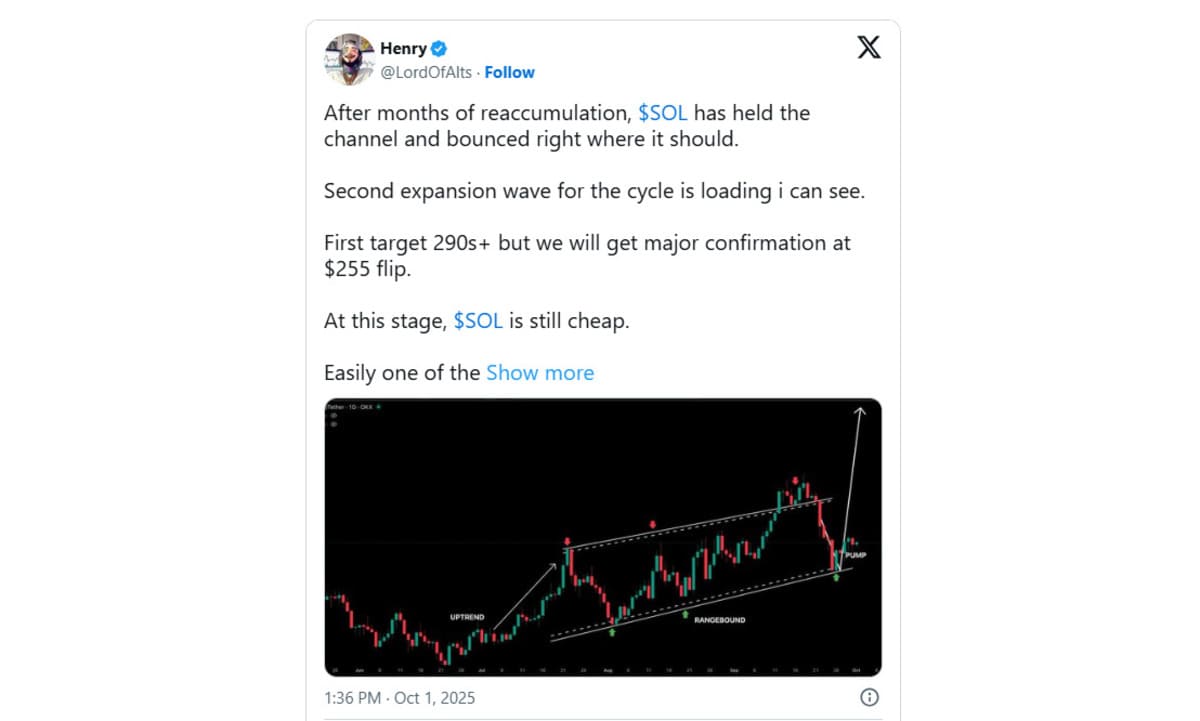 On X, Ali Martinez notes that the Solana price has completed a bullish retest. The analyst expects the SOL price to rise to $320–$360 in the coming weeks. Another market analyst, Henry, told his audience that Solana is ready for the second expansion wave.
