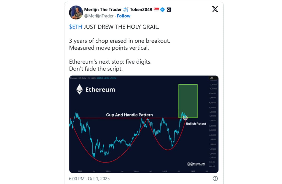 In a recent X post, top analyst MerlijnTrader notes that the Ethereum price has formed the holy grail. The Ethereum coin has broken out of a bullish cup-and-handle pattern that has been forming in the past three years.