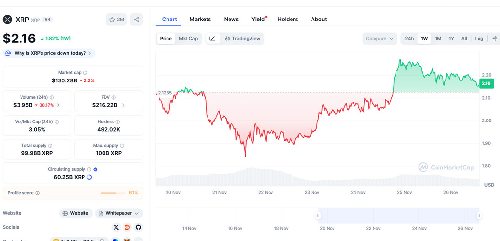 XRP has gained momentum after a recent pullback. The Ripple price now trades above the $2.10 level, per CoinMarketcap. Bulls had intervened when the value of XRP dropped below $2.00 last week.