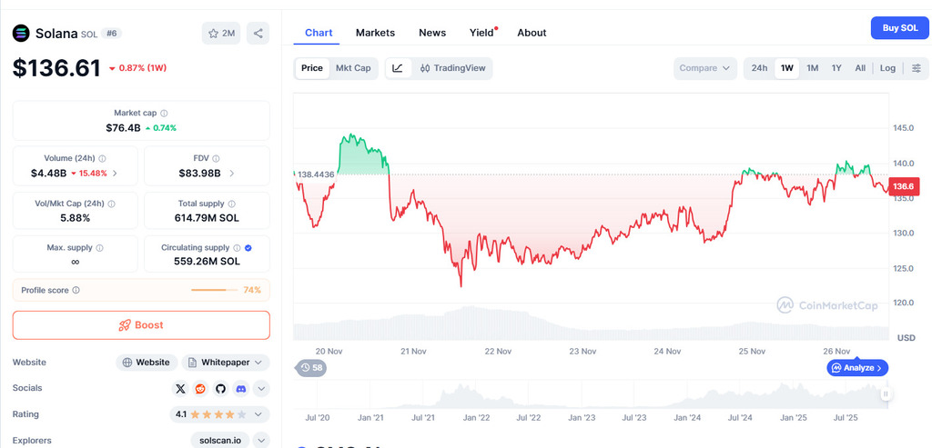 Solana is consolidating at $130-$140 according to CoinMarketCap. After a sharp mid-month selloff, the SOL price found support just below $130. The Solana price is currently staging a slow recovery. However, bulls have struggled to break past the $140 resistance.