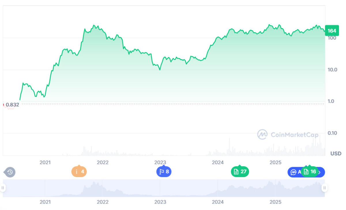 Technical analysis suggests a bullish continuation for $SOL, with key resistance levels at $172 and $175, while support is found at $165 and $162. At the moment, the Solana crypto price is $164.17, up by 4.95% during the past week. Its 24-hour volume stands at $5.86B, up by 12.14%.