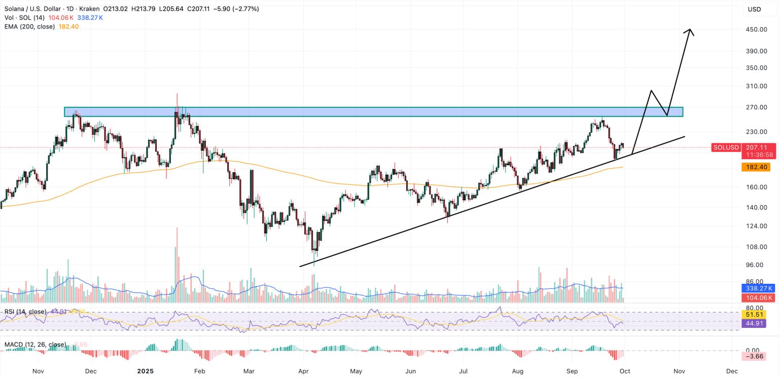 Solana is currently trading near $210. Traders are watching $270 as a key resistance level. If SOL breaks above it, analysts say the next target could be $450 in the coming months.