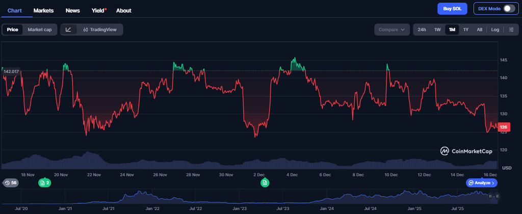 Solana has been under pressure on the price charts. CoinMarketCap data shows that the SOL price fell from around $130 to nearly $125 in the past seven days, alongside a broader monthly pullback.