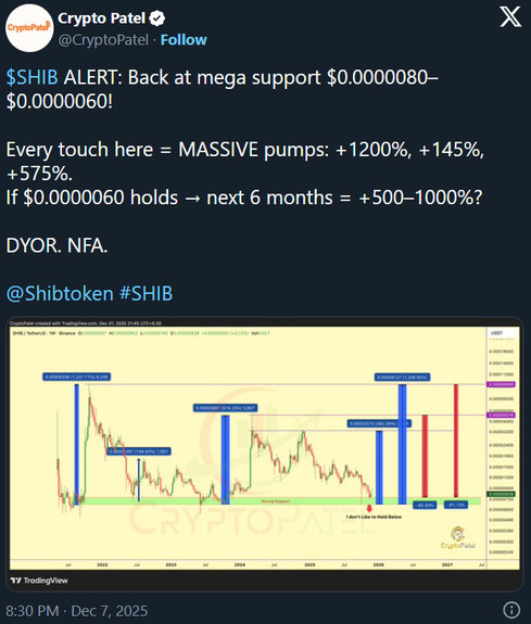 Some traders remain optimistic based on commentary from influencer Crypto Patel. In a recent X post, he said this meme coin was back near a support range around $0.0000080–$0.0000060 and suggested that prior rebounds from that area could repeat. Past price behavior does not guarantee similar outcomes in the future.