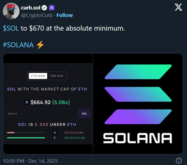 However, influencer Curb has argued that an uptrend could still develop for the Solana crypto. In an X post, he outlined a scenario in which the SOL price could reach $670, while noting that such an outcome would imply Solana approaching Ethereum-scale market capitalization. These are personal views and not forecasts, and market caps can change quickly with price and circulating supply.