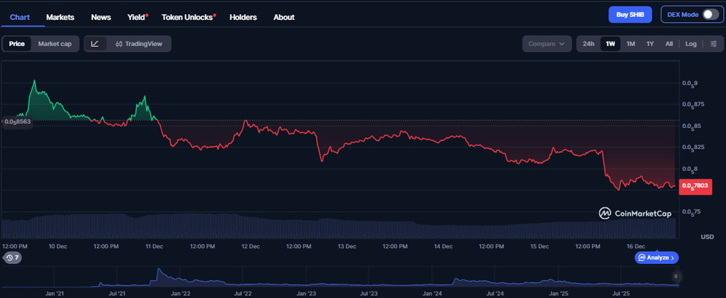 Meanwhile, TradingView indicators show bearish signals for the Shiba Inu crypto. Notably, its momentum indicator and MACD are displayed in negative territory, which some traders interpret as a sign that downside pressure could persist.