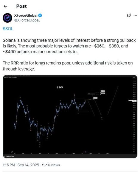 Retesting its 30-day high of $249 could push the altcoin price past $300, especially if volume remains strong. XForceGlobalās Solana price prediction targets $260, $380 and $460 before a āmajor correction sets in.āĀ