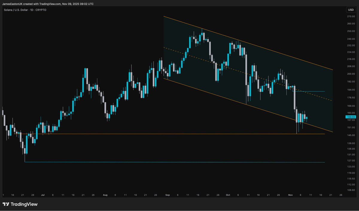 The Solana price remains under pressure, trading near $158.11 as investors question whether the token can reclaim the $200 level before the Fed’s upcoming rate decision. Despite strong institutional inflows into the Bitwise Solana Staking ETF (BSOL) — which has amassed over $545 million since late October — momentum has stalled.