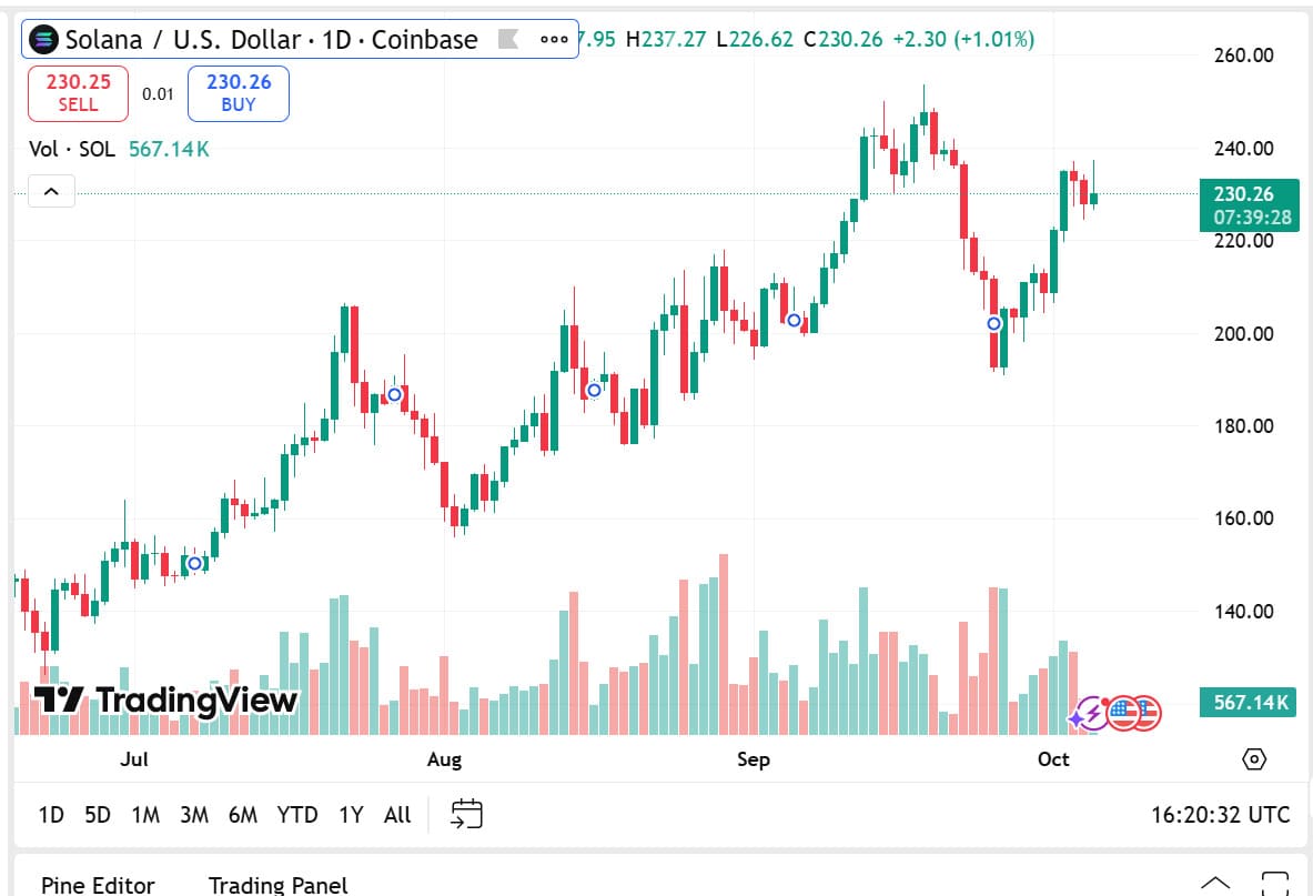 Solana is currently trading at $230.25, marking a 2.48% increase in the past 24 hours. The token boasts a strong $127.77 billion market cap, supported by $6.23 billion in daily trading volume, down 24.48% — a sign that long-term holders consolidate.
