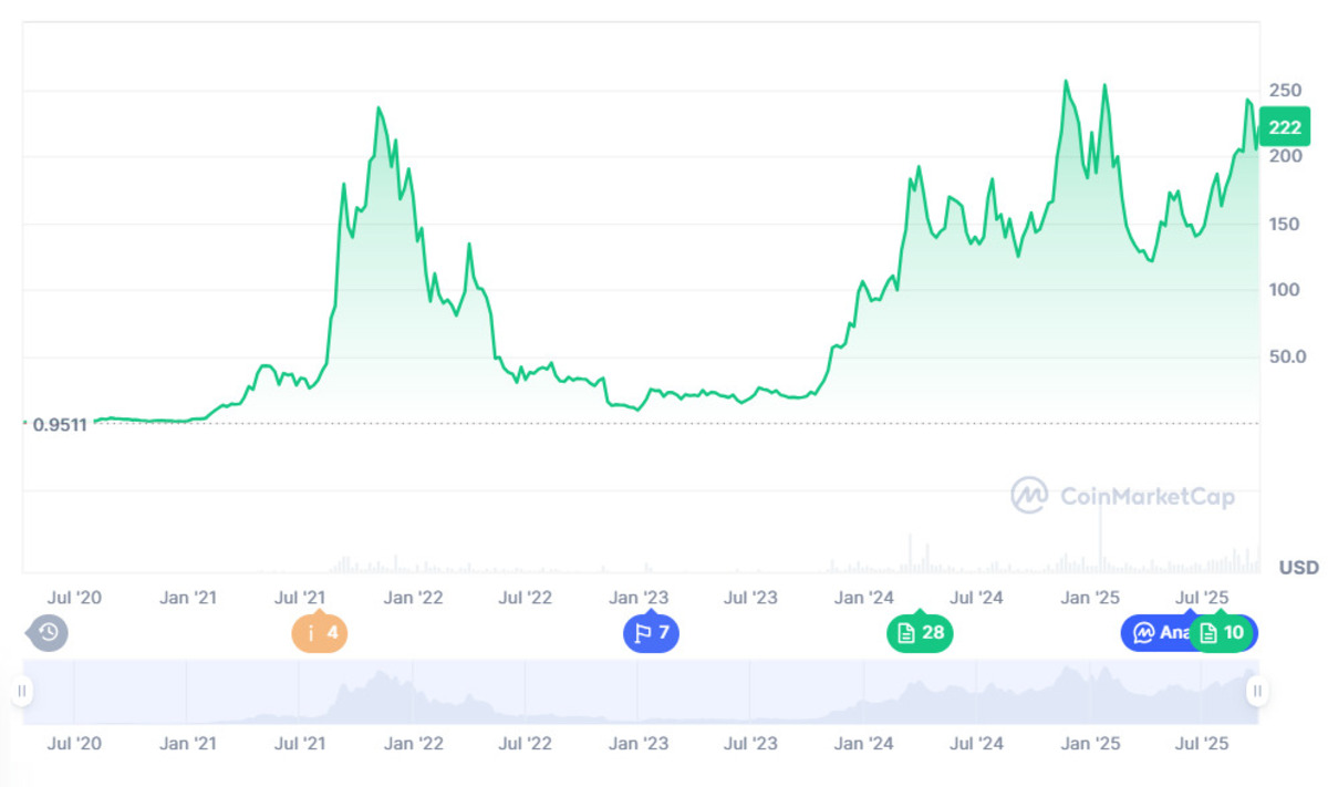 As of now, Solana trades at $222.20, with a market cap of $120.75 billion and daily trading volume around $8.54 billion. Price momentum is evident: a 5.86% increase in the past 24 hours, 5.18% over the week, 11.2% this month, and a powerful 51.94% gain over the year. From its all-time low of $0.5052 in May 2020 to its all-time high of $304.33 in January 2025, Solanaās trajectory represents a staggering 26,606.66% lifetime increase.