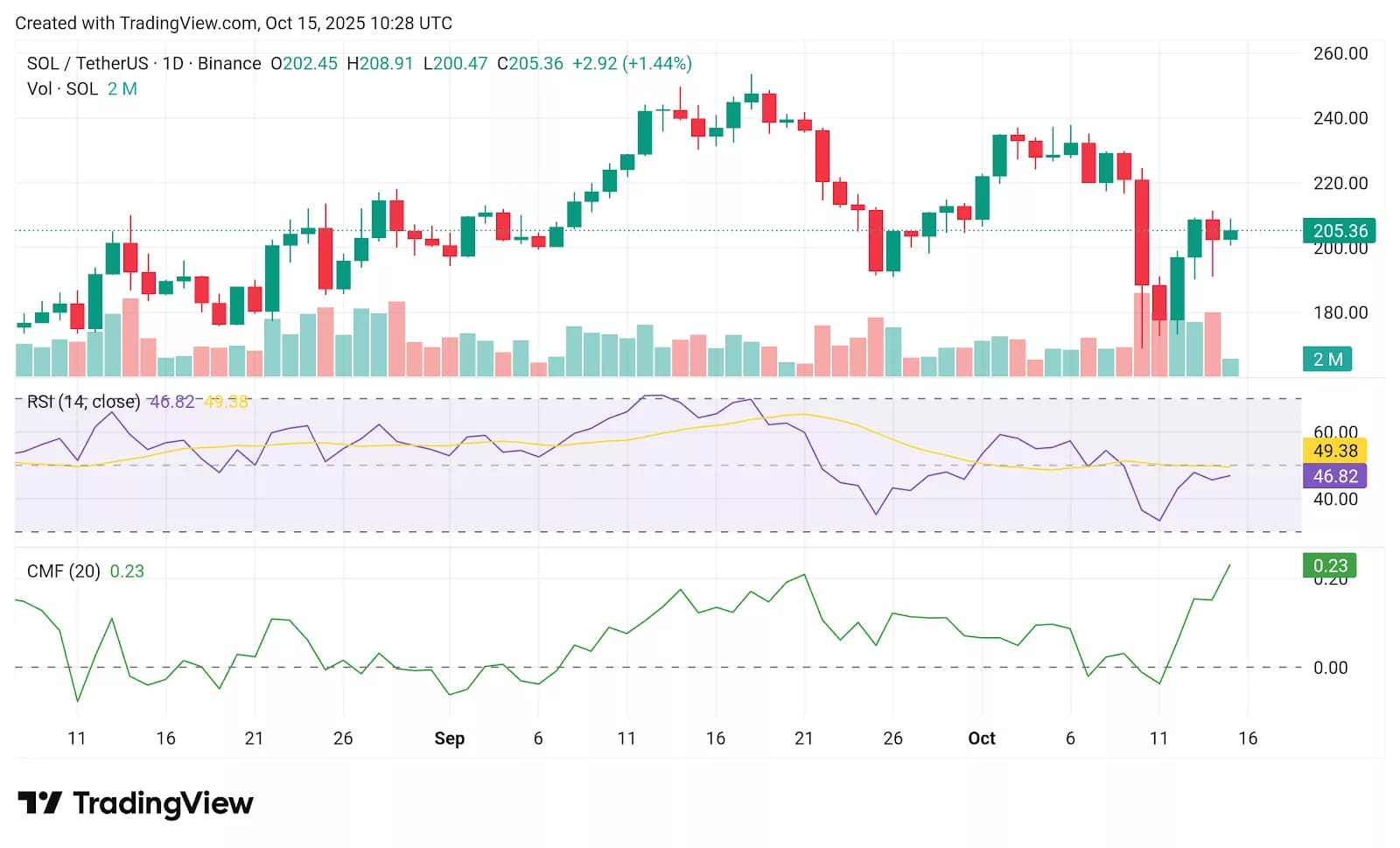 Solana (SOL) is showing signs of strength following a sharp decline that saw prices fall below $190 earlier this week. The token has lost about 6.6% in the last 24 hours, trading at around $205.36. Its Relative Strength Index (RSI) has moved to 46.82, which is just below the neutral 50 mark, indicating that bullish momentum is gaining.