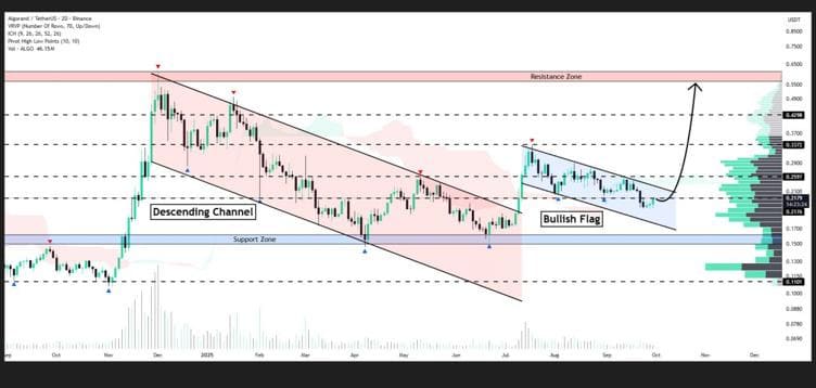 ALGO is trading at $0.215. The Algorand latest news reveals that the token is forming a Falling Wedge pattern, which many analysts view as a bullish reversal setup. A successful breakout could lead the price to $0.3352 and even $0.60.