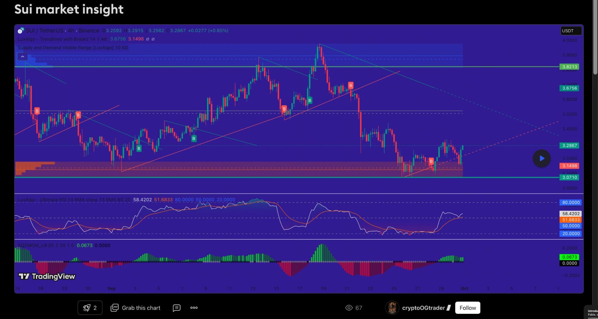 SUI is currently trading around $3.40 after it dropped to $3.21 when Coinbase announced it would list SUI futures contracts on October 20. However, analysts suggest that passing $3.33 could cause a further increase, targeting $3.80 and $4.00.
