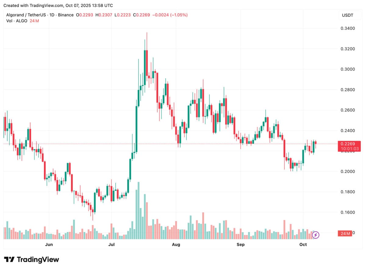 Algorand trades near $0.2269 and continues to invest in developer tools and performance.Ā  Upgrades such as the AlgoKit 3.0 have contributed to Algorand attracting more builders, and some predictions suggest that the price could reach $0.60-0.90 by the end of 2025, if adoption is faster. Algorand has traded horizontally on multi-year charts and has created a broad base; the more it coils, the more likely a breakout would be in case demand recovers.