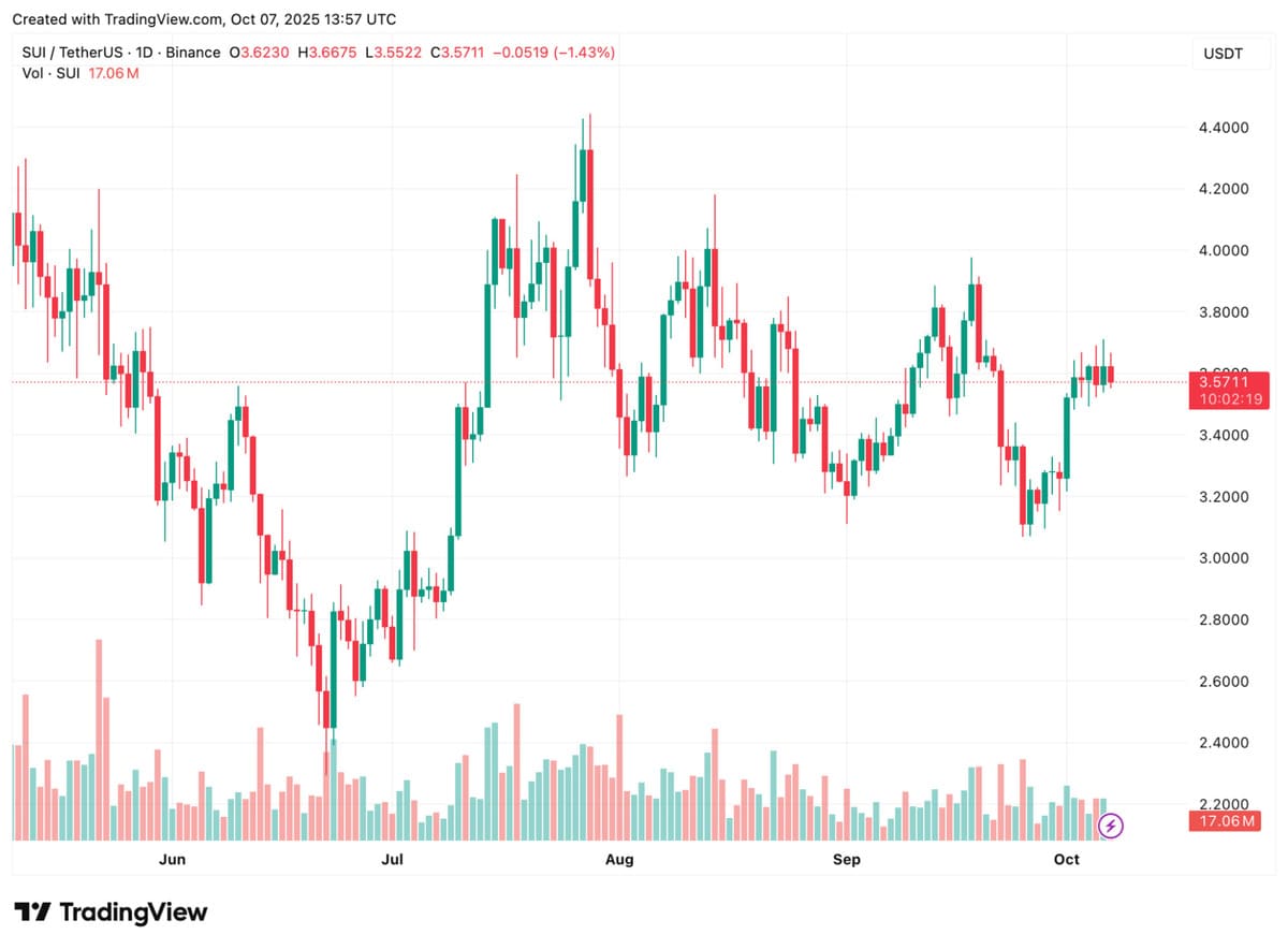 For any SUI price prediction, price and supply both matter. The SUI price is $3.57, following a weekly gain of approximately 12%, after rebounding from $3.08 to highs near $3.66. Bulls now face key resistance at $3.76, with a secondary wall near $3.98. RSI around 53 and a modestly positive MACD suggest a balance between buyers and sellers.