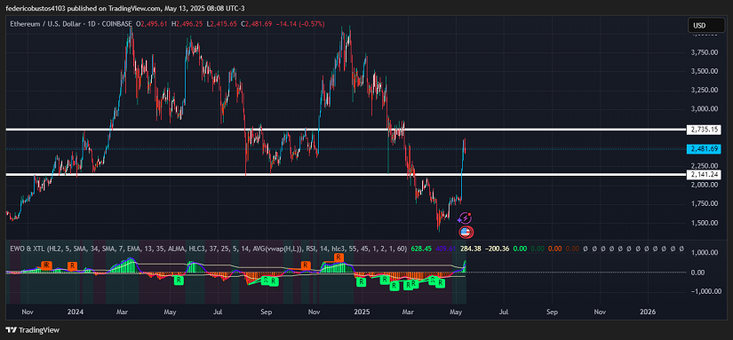 On a daily timeframe chart, Ethereum shows mixed signals but leans toward exhaustion of its rally. After a vertical climb of over 40% from May 8 to $2,624, the price has begun to show signs of weakness. It is currently trading at $2,481.69, down 0.57% on the day, right in the middle of the channel defined by support at $2,141 and resistance at $2,735, signaling a possible consolidation or reversal range.