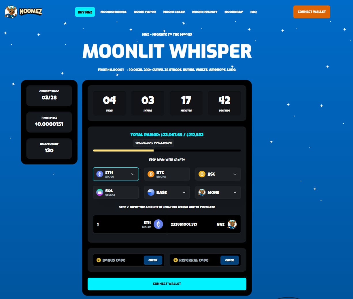 For beginners who want early exposure without complexity, Noomez ($NNZ) is a standout. The project runs on a transparent 28-stage presale that automatically burns unsold tokens, tightening supply after each round.