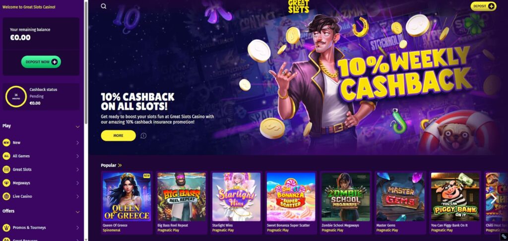 Great Slots keeps it simple: strong bonuses, quick payments, and a game lobby stacked with favourites. Big names like Pragmatic Play, Spinomenal, and Booming Games headline the slots, while live tables add extra bite. For UK players wanting an easy mix of slots and live action without GamStop limits, this one hits the mark.