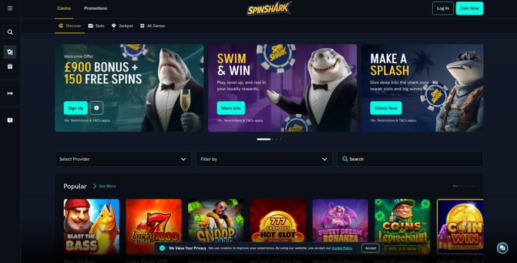 The game library is packed with categories such as Fishin’ Games, Live Lounge, Trending Games, Hold and Win, Megaways, Jackpots, and SpinShark’s own Top 10 picks. The theme carries through the slot selection, with fun underwater titles mixed with modern releases from trusted studios. The site’s speed and clear layout make it easy to jump between games and grab new offers throughout the week.