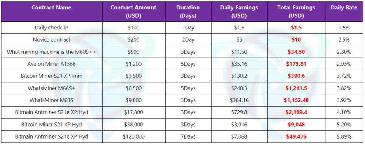 Log in to the dashboard, choose a suitable mining contract, and the system automatically settles earnings daily