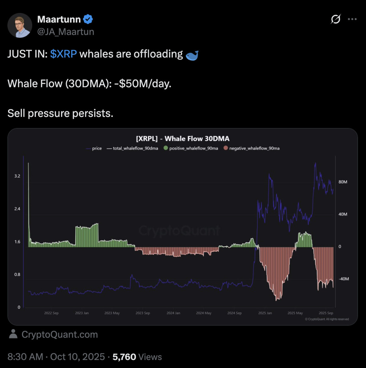 Whale activity could be the key reason. According to CryptoQuant whale flow data, more than $50 million in XRP is leaving large wallets each day. This constant outflow might be keeping sentiment weak and sellers in control.