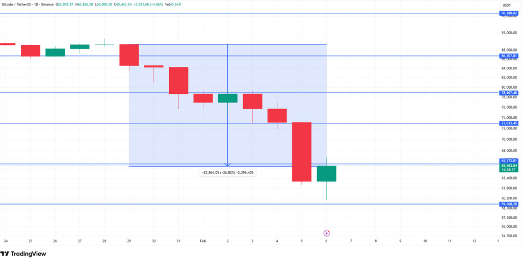 The long lower wick on recent candles suggests reactive buying interest around $63,400–$65,700. If this demand holds, Bitcoin could attempt a corrective bounce toward $73,013. A successful reclaim of this level would open the path toward $78,907, where prior support has flipped into resistance.