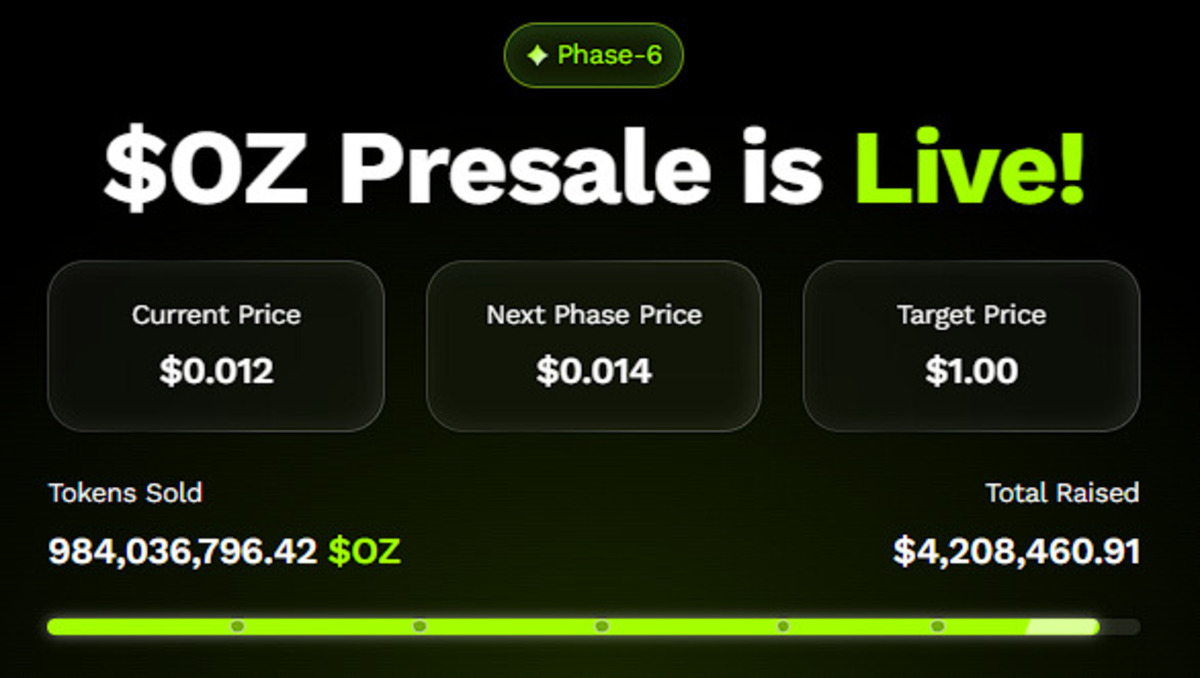 While Solana and Ethereum anchor the large-cap narrative, Ozak AI is quickly emerging as one of the most anticipated early-stage opportunities of 2025. Currently in its 6th OZ presale stage, Ozak AI has already raised over $4.2 million and sold more than 980 million tokens.