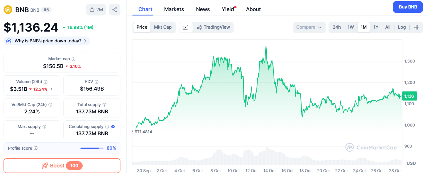 BNB is showing impressive price strength, hovering near $1,136. Key resistance levels sit at $1,200, $1,275, and $1,350, while support holds at $1,080, $1,000, and $920. As the native token of Binance, BNB benefits from massive ecosystem utility, spanning exchange functions, DeFi applications, token burns, and more.