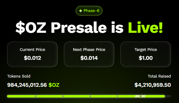 While DOGE and BNB offer strong ROI potential, Ozak AI is capturing attention as a possible 100x play. Currently in its 6th OZ presale stage at $0.012, Ozak AI has already raised over $4.2 million and sold more than 980 million tokens.