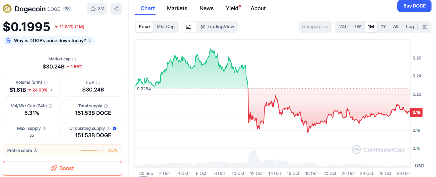 Dogecoin is trading around $0.1995 and remains a major force among meme coins. Resistance levels are forming at $0.225, $0.265, and $0.300, while strong support sits at $0.185, $0.162, and $0.140. DOGE’s strength lies in its unrivaled community and ability to generate viral hype during bull runs.