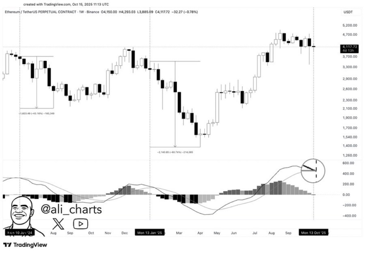In another breakdown, Ali Charts noted that Ethereum (ETH) is nearing a bearish MACD crossover on the weekly chart — a signal that has led to 43% and 61% drops in previous cycles. As this unfolds, a Wall Street analyst warns of further downside, noting that Ethereum whales are moving capital into PDP, which is still in its early presale phase and trading below $1.