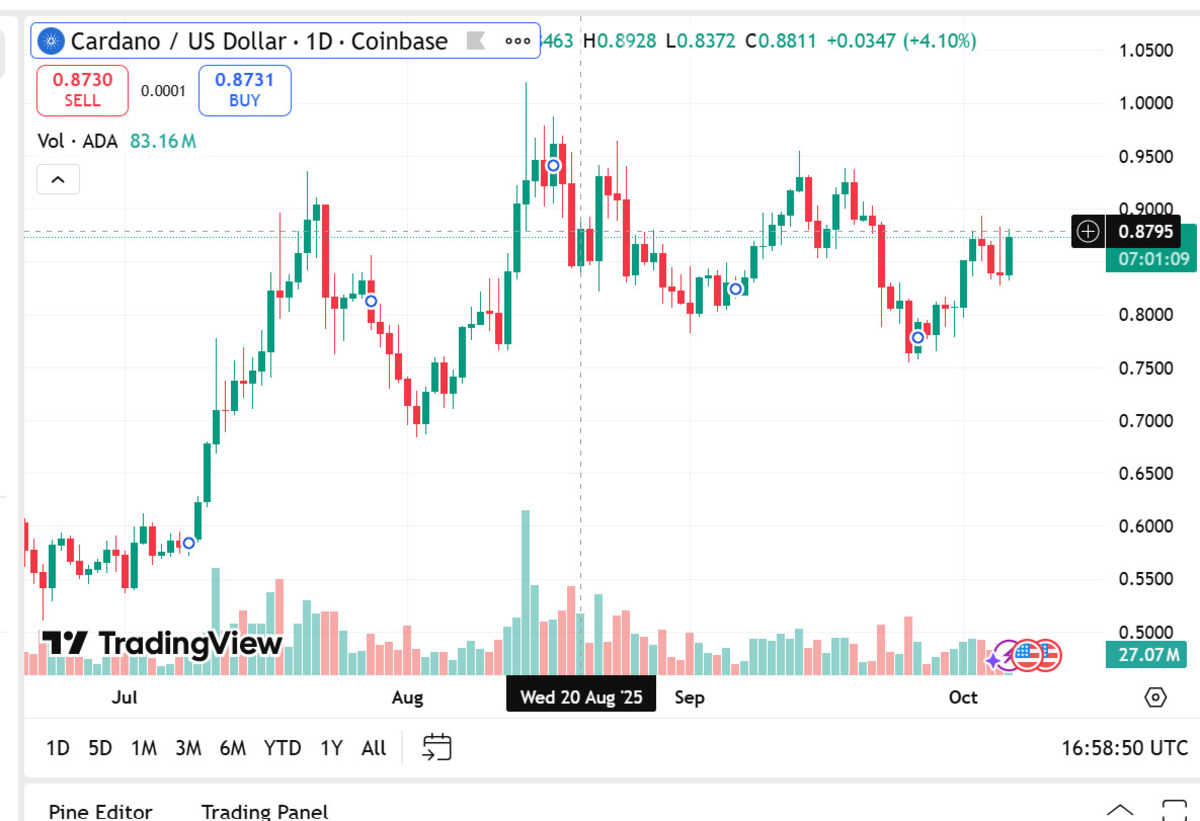 By contrast, Cardano (ADA) is valued at $0.8730, losing 2.62% in the last 24 hours. Its market cap of $30.46 billion has a $1.23 billion trading volume backing it, which rose by 3.68%.