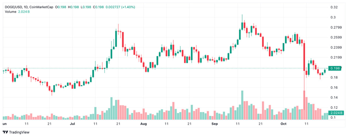 DOGE tells a similar story from another angle. It’s been sitting around $0.2 for weeks, occasionally boosted by social media buzz, yet the price barely reacts.