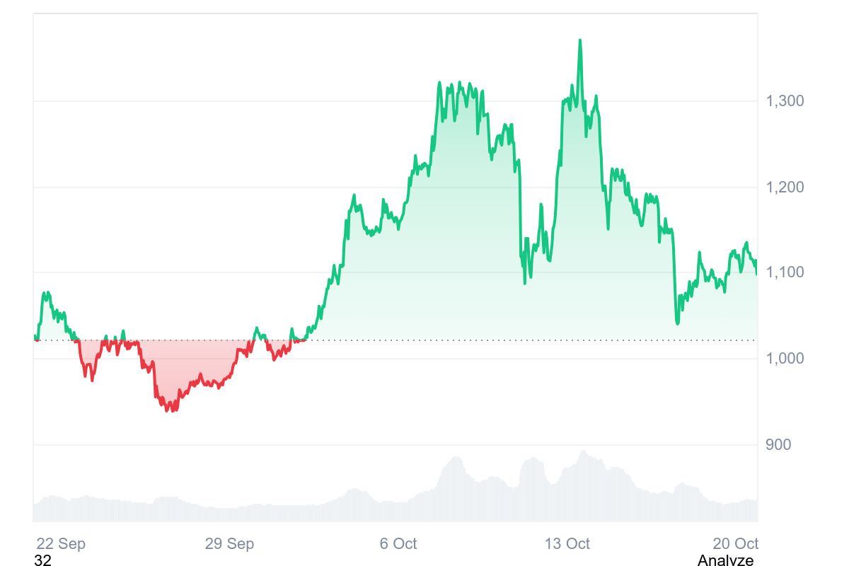 BNB tells a similar story. At roughly $1,100, it remains one of the stronger majors by market cap, but activity on the Binance Smart Chain has flattened.